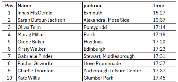 With 15:27 at Exmouth on New Year’s Day, Innes FitzGerald tops the women’s rankings this week. That time is the fastest ever parkrun by a British female, improving Melissa Courtney-Bryant’s 15:31 from December 2022.