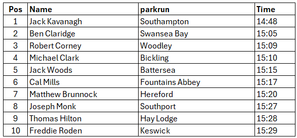 Ben Claridge’s 15:05 at Swansea Bay puts him second in the men’s rankings. That time improves his previous parkrun best of 15:21 and is a good start after PBs in distances from 800m to 10k in 2025. Just four seconds behind was Robert Corney who ran 15:09 at Woodley.